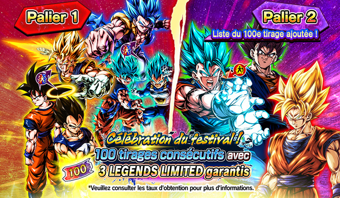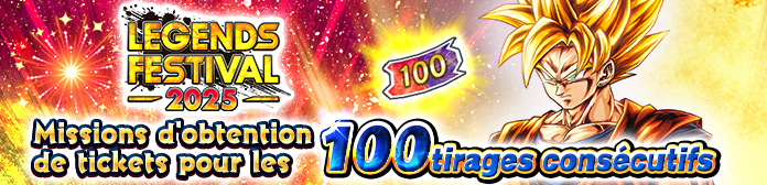 *Les Tickets de tirage NEXT LEGENDS FESTIVAL SPARKING A obtenus lors du Compte à rebours du Festival peuvent être échangés contre des « Ticket de tirage SP garanti Fusion de la résurrection !! Son Goku et Vegeta [1200 Pouvoirs Z] ».